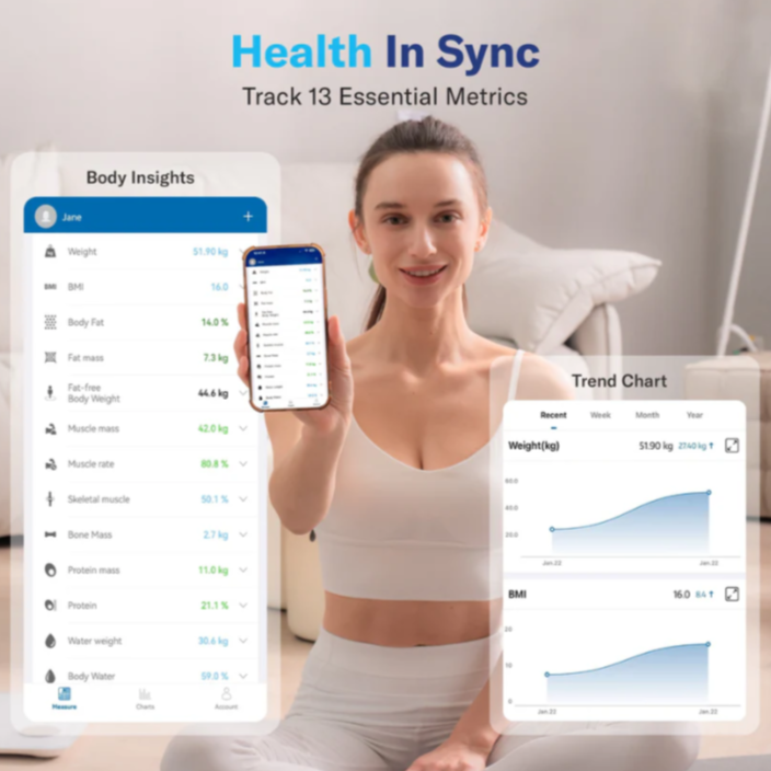 Our smart scale goes far beyond simple weight. It provides a comprehensive analysis of 13 key wellness metrics, including body weight, BMI, body fat percentage, visceral fat, muscle mass, bone mass, body water percentage, protein mass, metabolic age, and more. This gives you a complete picture of your health and helps you track your fitness journey effectively.